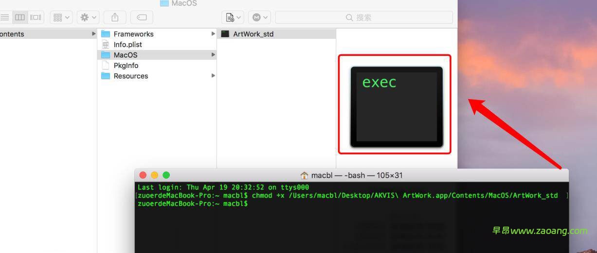 - 接下来,打开终端应用程序,在终端窗口中输入 “chmod +x” ,务必注意 “chmod” 与 “+x” 之间需保留一个空格,之后再空一格,将刚才找到的 “ArtWork_std(或 Plugin Installer)” 文件直接拖入终端窗口内,最后按下回车键。
